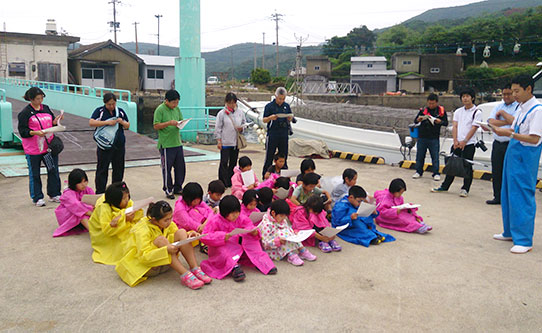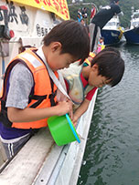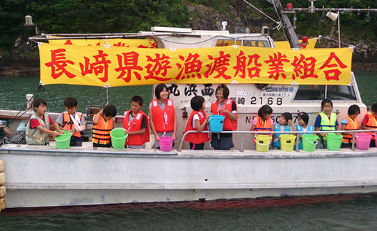 2014年7月2日、長崎県遊漁渡船業組合の主催でマダイの稚魚放流が行われました。組合長は浜本釣センターの浜本誠司船長です。平戸市立堤小学校の児童18名に参加していただきました。今年は7センチまで育った稚魚5000匹を放流しました。