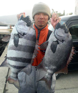 2月9日、徳永さんは、地磯にてイシダイ62.5cm4.35kg、56cm3.2kgをGET!おめでとうございます!! |